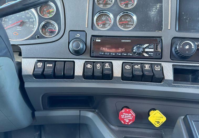 The 2016 Kenworth T880 dump truck has 327,746 miles on the odometer and 12,121 hours on the meter. It is powered by a Paccar MX-13 engine with a 12.9L displacement and 6 cylinders, running on diesel fuel and producing 455 horsepower. The engine features an engine brake for improved control.