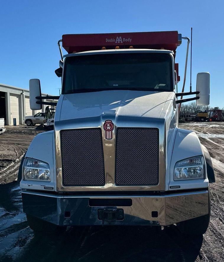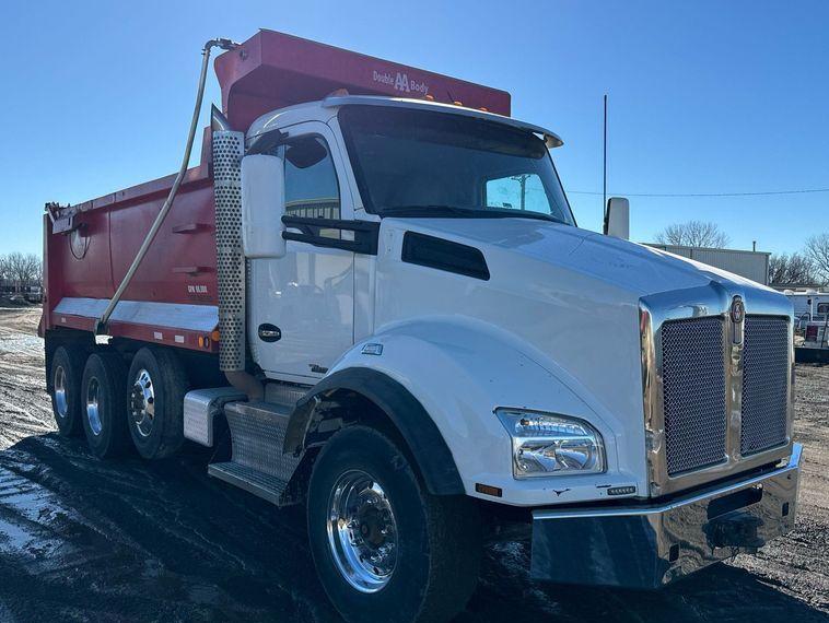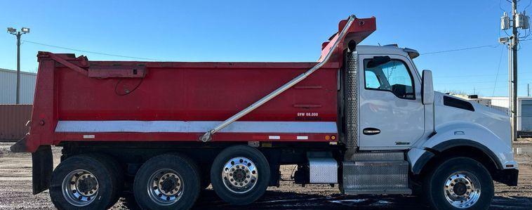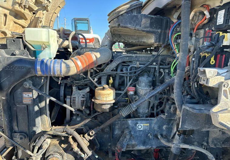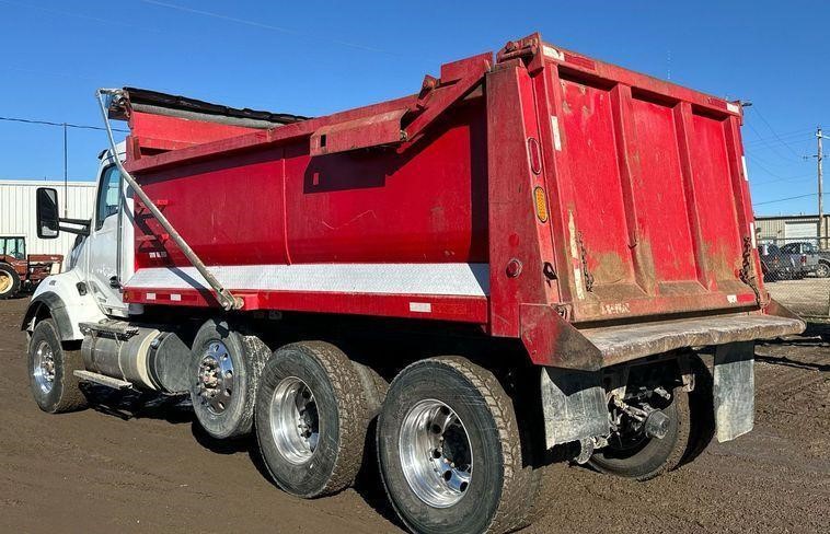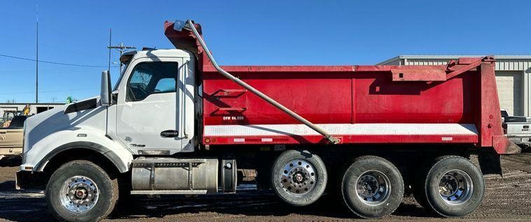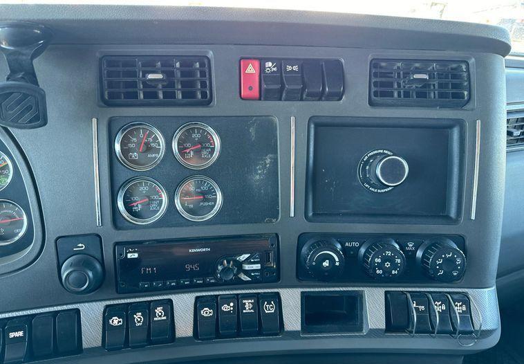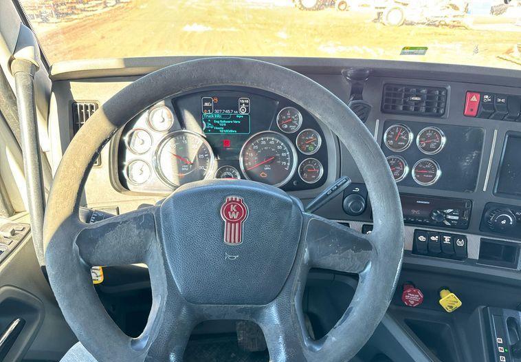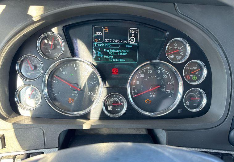 The 2016 Kenworth T880 dump truck has 327,746 miles on the odometer and 12,121 hours on the meter. It is powered by a Paccar MX-13 engine with a 12.9L displacement and 6 cylinders, running on diesel fuel and producing 455 horsepower. The engine features an engine brake for improved control.
