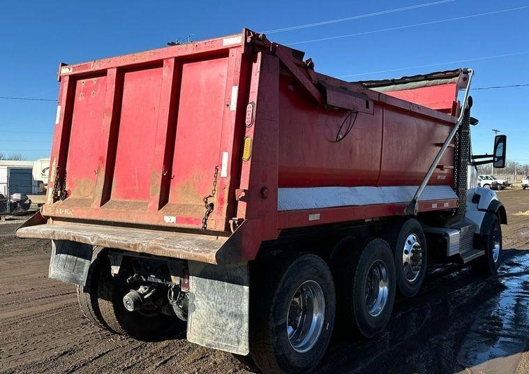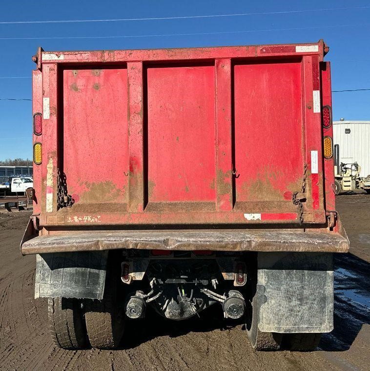 The dump bed is a Double A Body Builders steel bed measuring 16 feet long by 97 inches wide, with a side height of 48 inches. It features a roll tarp, although the tarp arm is cracked, a single ram, and an air-operated end gate.
