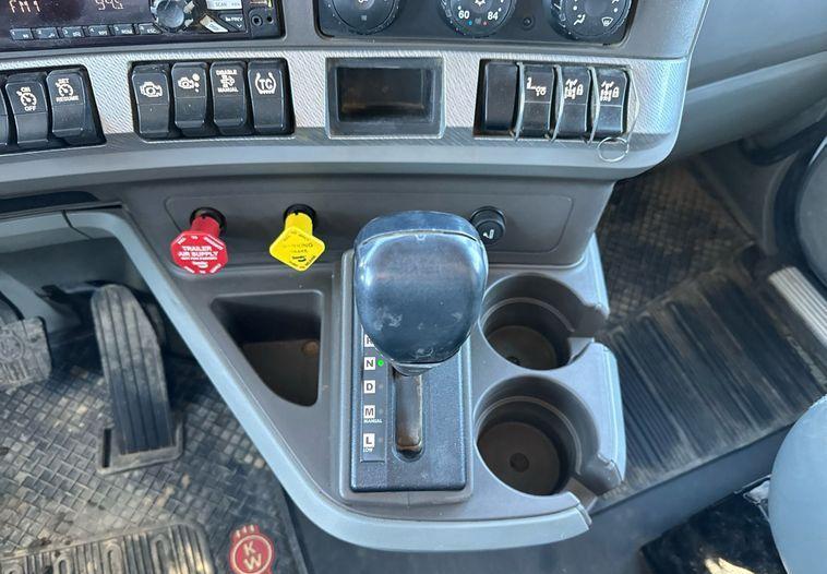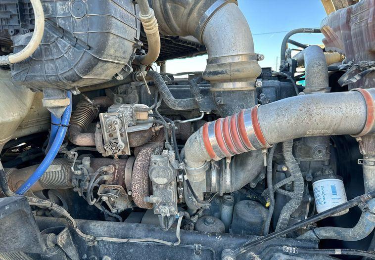 The transmission is an Eaton Fuller automated manual. The chassis has a double frame with triple axles, including a pusher axle and steerable axle, full differential lock, and spring over walking beam suspension. It is equipped with dump valves, air brakes, and a PTO system.