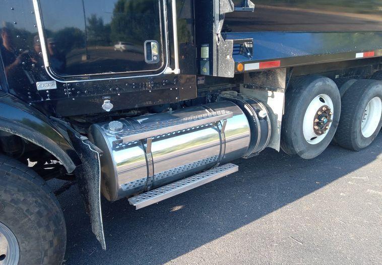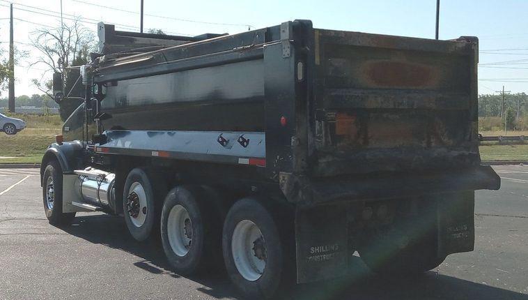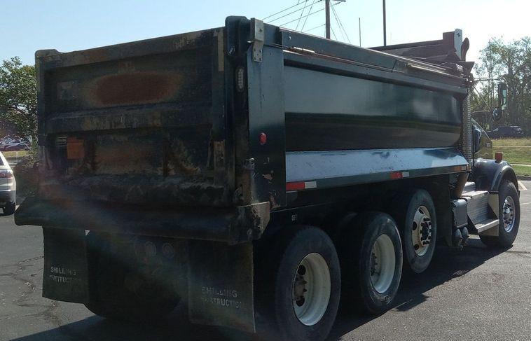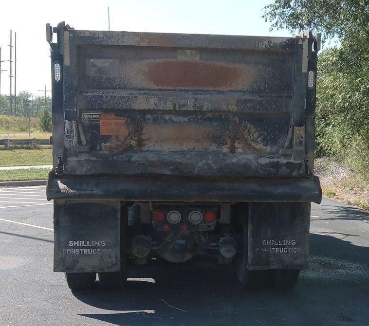 The dump bed is an Oxbody steel bed measuring 16 feet long by 98 inches wide with a capacity of 12 to 14 cubic yards. It features a roll tarp and an air-operated end gate.