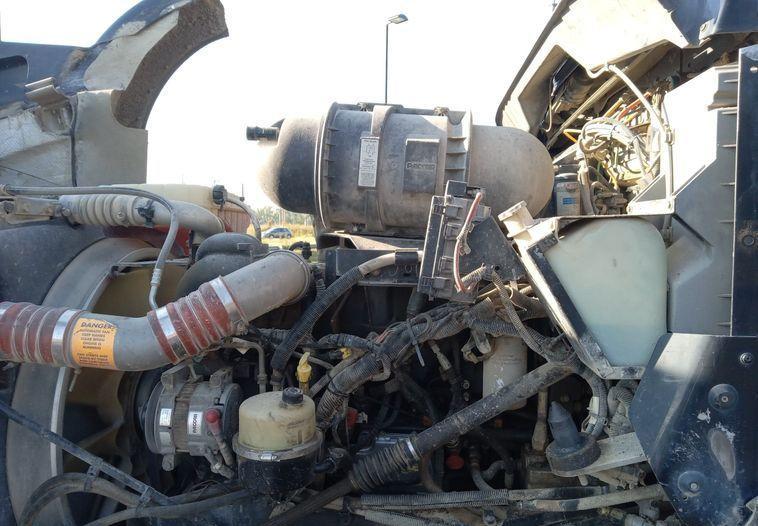 The transmission is an Allison automatic. The chassis features triple axles, including a pusher axle and steerable axle, with an inter-axle differential lock. Suspension is spring over walking beam. The truck has air brakes and a PTO system.