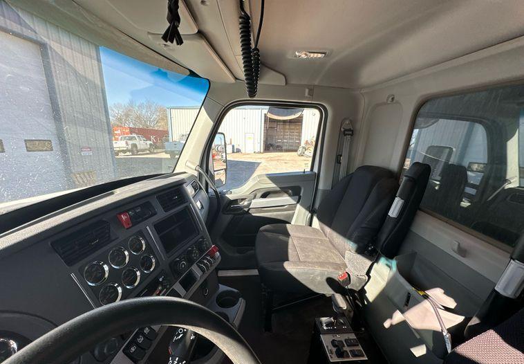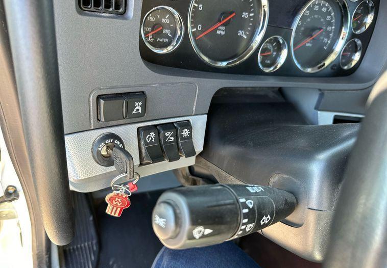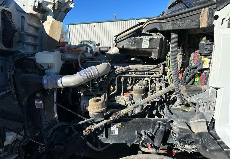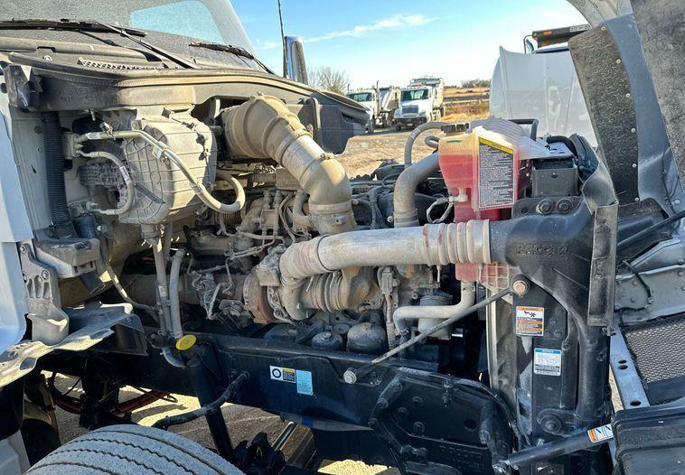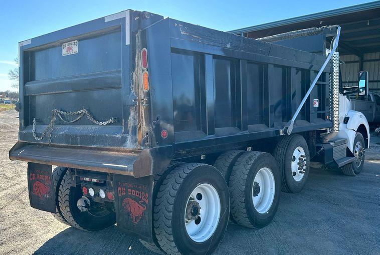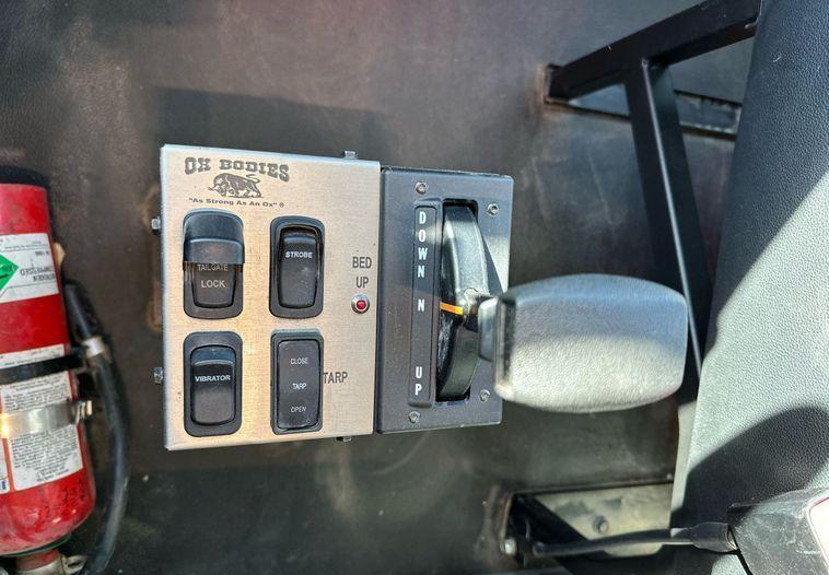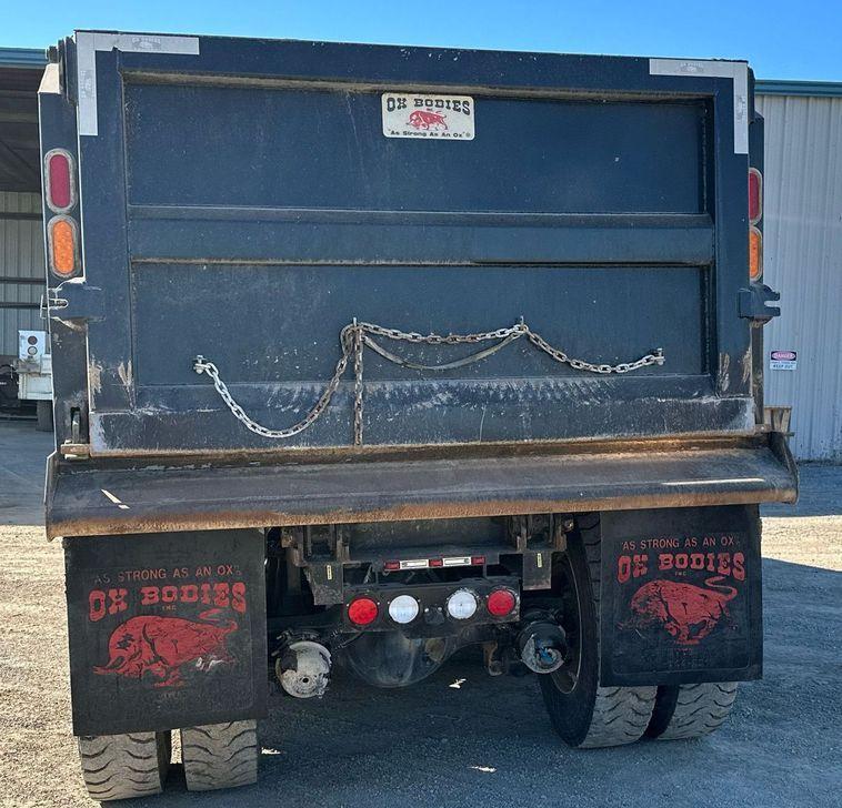 This unit is equipped with a 16-foot long, 8-foot wide steel dump bed manufactured by Ox Bodies. The side height is 45 inches with an additional 8-inch side board. The bed also includes a bed vibrator, roll tarp, single hydraulic ram, and air-operated end gate.