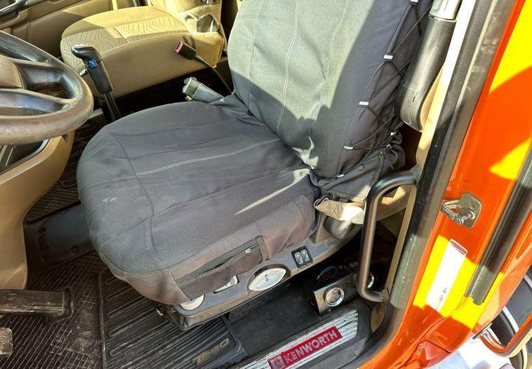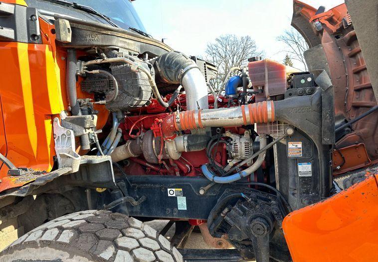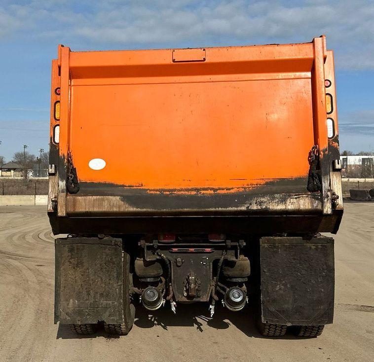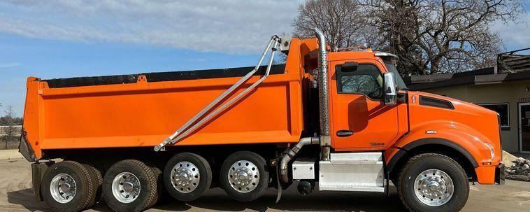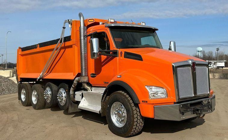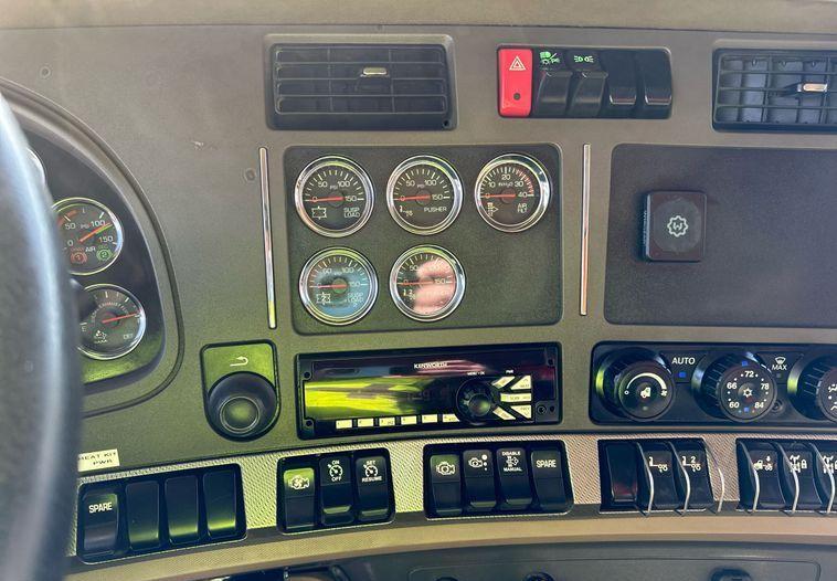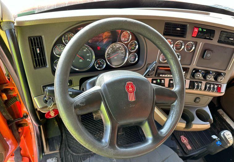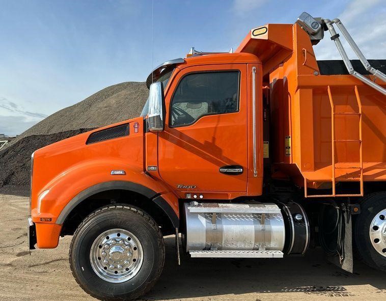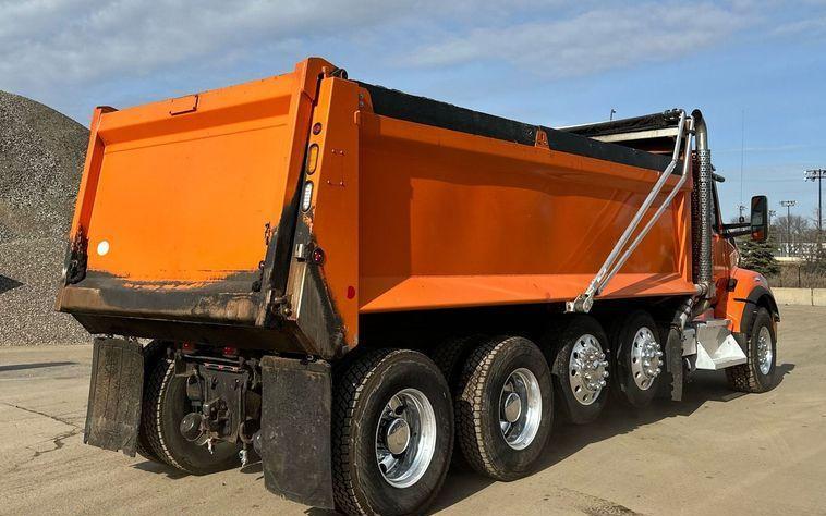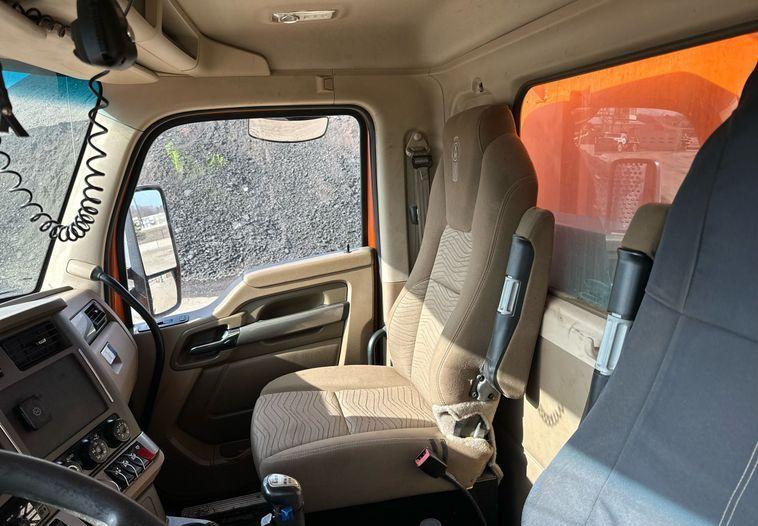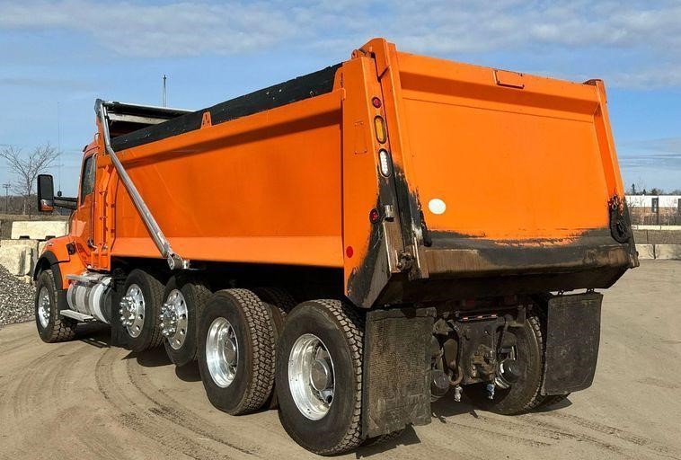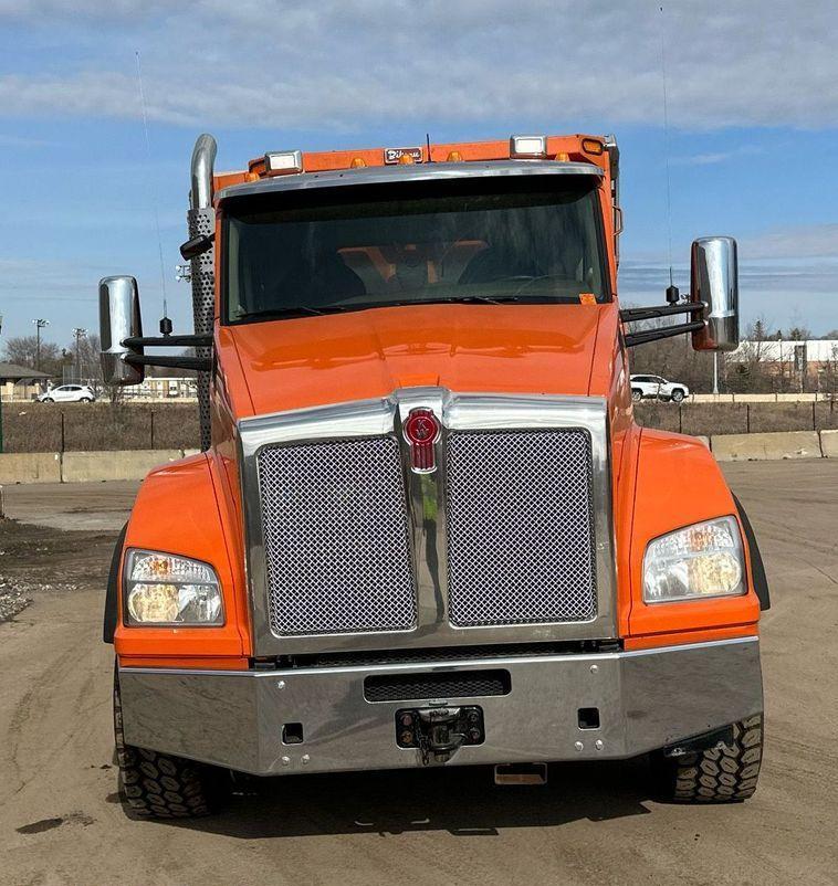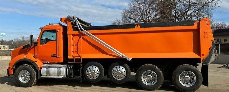 2018 Kenworth T880 dump truck with 176,845 miles on the odometer and 10,805 hours on the meter Powered by a Cummins ISX12 engine with 11.9L displacement 6 cylinders diesel fuel and 425 horsepower Engine brake Transmission Eaton Fuller 8LL manual 10 speed Chassis with 4 axles 3.55 gear ratio pusher axle steerable full differential lock air suspension dump valves air brakes and PTO GVWR 68,000 lbs FAWR 18,000 lbs IAWR 20,000 lbs RAWR 20,000 lbs lift axle GAWR 13,500 lbs Interior includes AC heat heated mirrors power windows cruise control and brake controller Dump bed Bibeau 19 feet long by 99 inches wide side height 48 inches side board height 7 inches steel bed with roll tarp single ram and air operated end gate Tires front 385/65R22.5 rear 11R22.5 lift axle 255/70R22.5