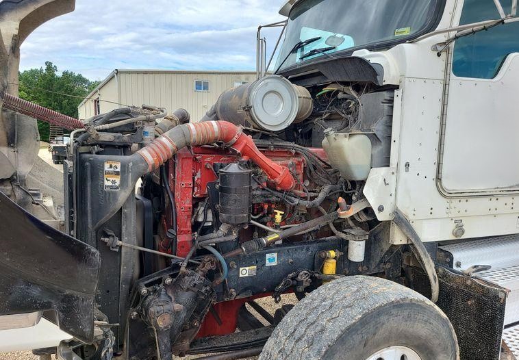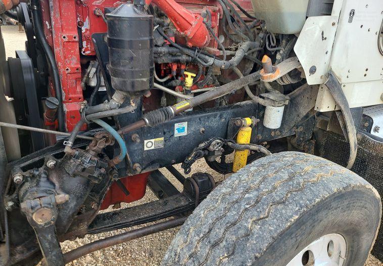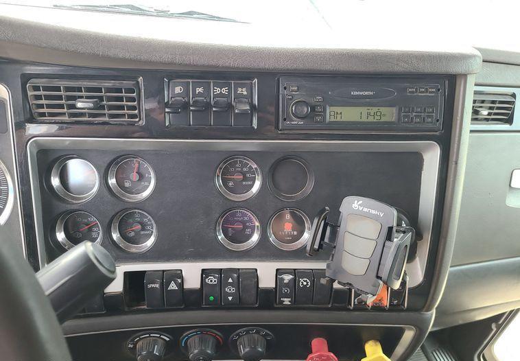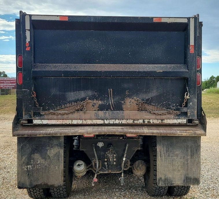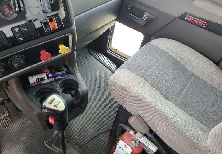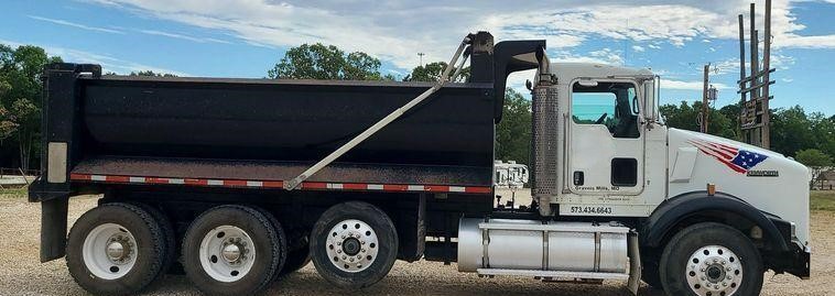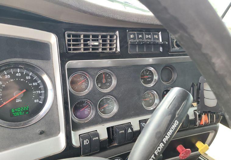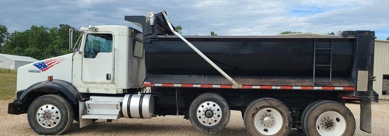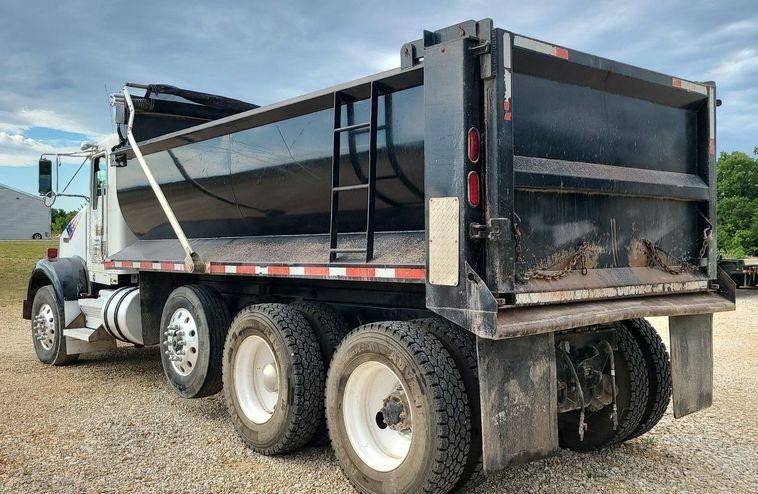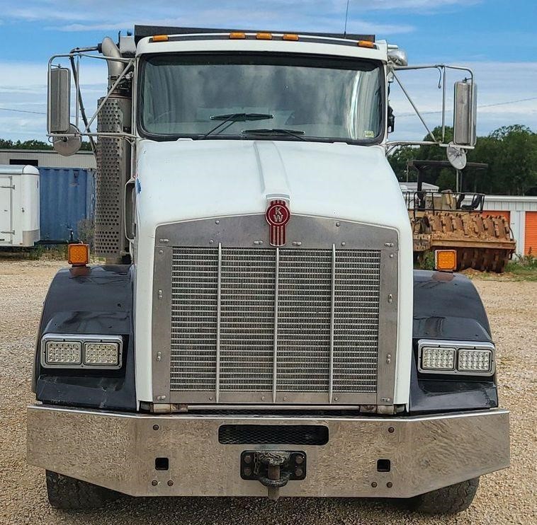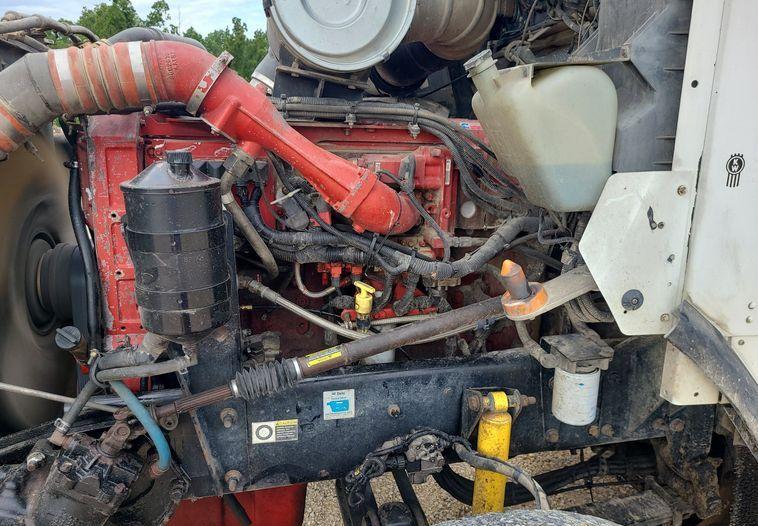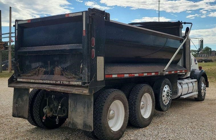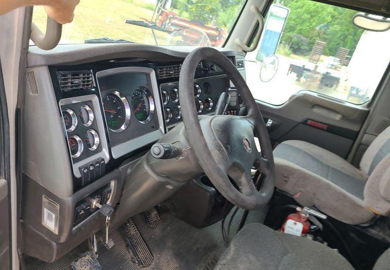 The 2007 Kenworth T800 dump truck has 640,222 miles and 23,150 hours. It is powered by a 14.9-liter Cummins ISX diesel engine with six cylinders and features a 13-speed manual transmission. The chassis includes triple axles with a pusher axle, spring over walking beam suspension, air brakes, and a PTO. The interior is equipped with air conditioning, heat, and cruise control.